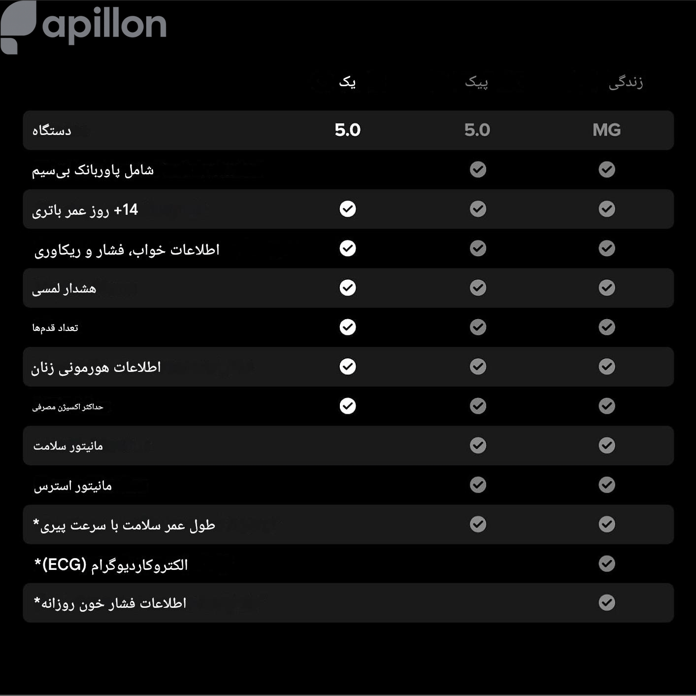 | شاخصهای قابل ردیابی | ضربان قلب، HRV، خواب، VO2 Max، چرخه قاعدگی، فعالیتها، استرس، ریکاوری |