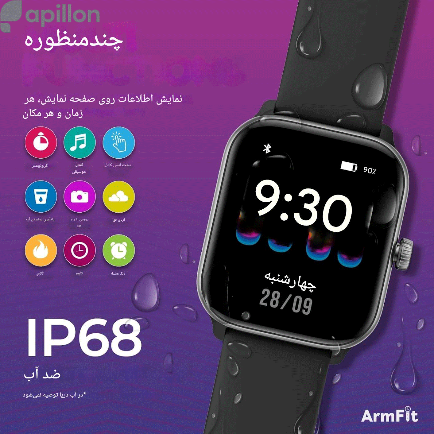 دارای گواهی ضدآب IP68 (مناسب برای شستوشو و فعالیت روزمره، اما نه برای شنا در عمق یا سونا)